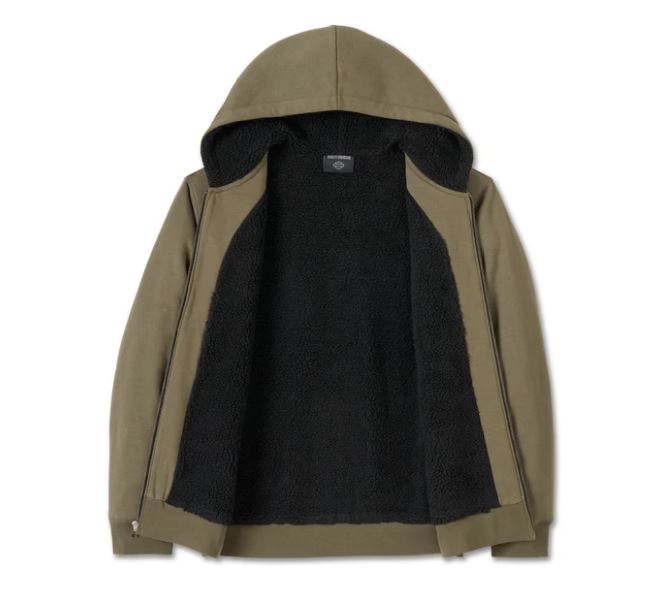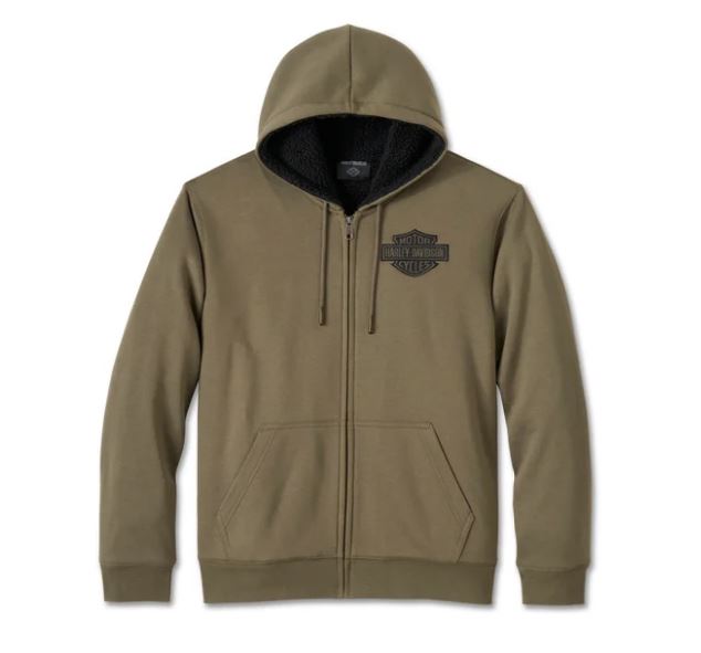 Unser Bar & Shield Sherpa Full Zip Hoodie ist der kuscheligen Look, nach dem Du Dich gesehnt hast. Durch das wärmende, kontrastierende Sherpa-Innenfutter stellt dieses Hoodie ein Upgrade des typischen Herren-Kapuzenpullis mit Frontreißverschluss dar. Für einen zeitlosen H-D Look sorgt unser legendäres Logo, das auf der Vorderseite eingestickt ist.