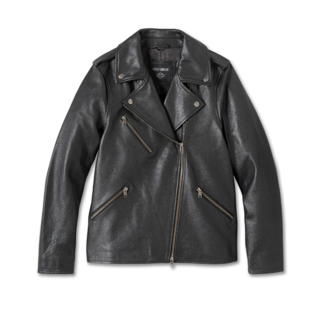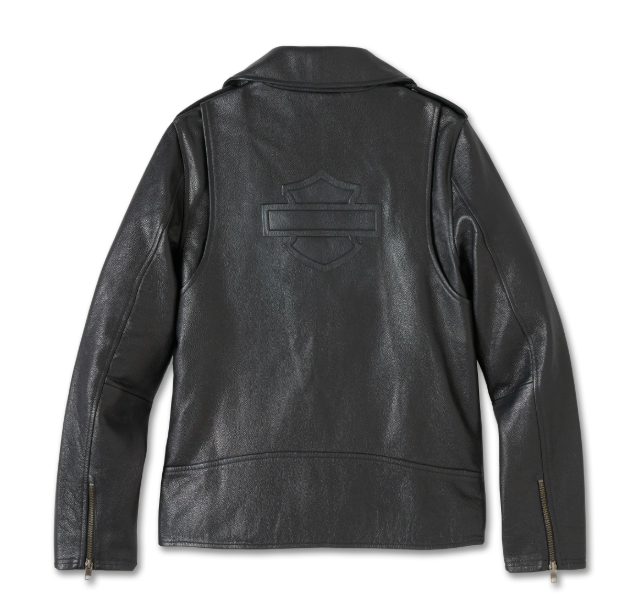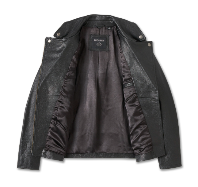 Lederjacke aus 100% Rindsleder, Design im Bikerstil mit Kragen und schiefem Reißverschluss, B&S Logo eingeprägt am Rücken