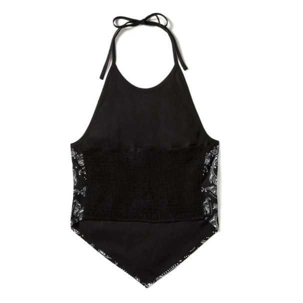- Design-Details: Slim-Fit. Halter-Ausschnitt mit gebundenen Trägern. Brustabnäher. Am Rücken Faltenbesatz mit Gummizug. Zipfelsaum vorn, verkürzter Rücken. Individuelles All Over-Muster vorne.