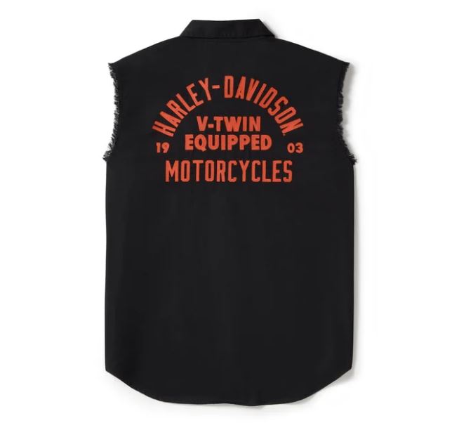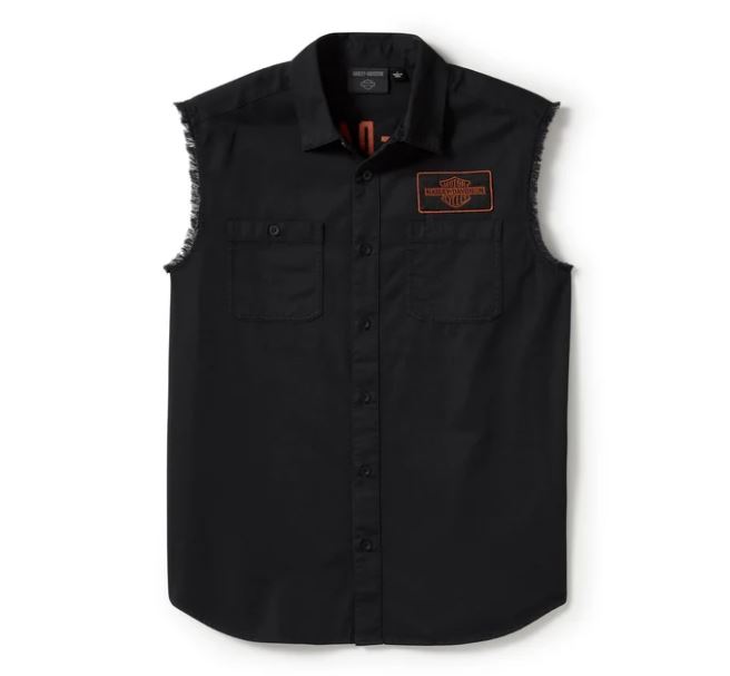 Vintage-Stil dominiert bei unserem V-Twin Equipped Solid Blowout. Aus robustem, aber atmungsaktivem und leichtem Baumwolltwill gefertigt, der für einen getragenen Look weich gewaschen wurde. Dieses ärmellose Herrenhemd mit Knopfleiste verfügt über eine Stifttasche, Fransen am Armausschnitt und Knöpfe mit Logo für zusätzlichen Style und Komfort sowie einen Kragen mit verdecktem Druckknopfverschluss, der unter der Motorradbekleidung nicht verrutscht. Der bestickte Aufnäher auf der Vorderseite imitiert unser Bar & Shield aus den 1930er Jahren, während die Rückseite mit Kettenstich-Grafiken, inspiriert von unserem Archiv, voll aufs Ganze geht.